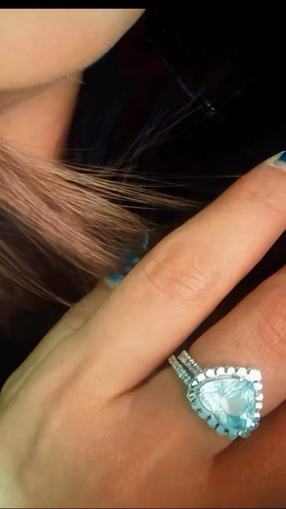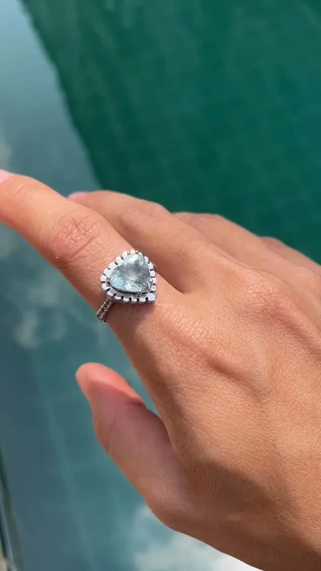 A ring that conveys the charm of winter through the sparkle of a clear blue aquamarine cut in a heart shape, giving a sense of peace and warmth. Decorated with natural zircons, sparkling like diamonds, like snowflakes when exposed to light✨❄️
